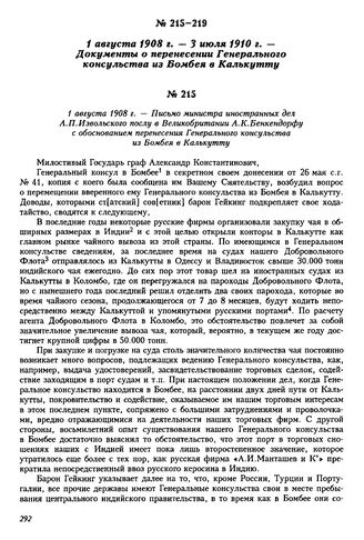 1 августа 1908 г. — Письмо министра иностранных дел А.П. Извольского послу в Великобритании А.К. Бенкендорфу с обоснованием перенесения Генерального консульства из Бомбея в Калькутту