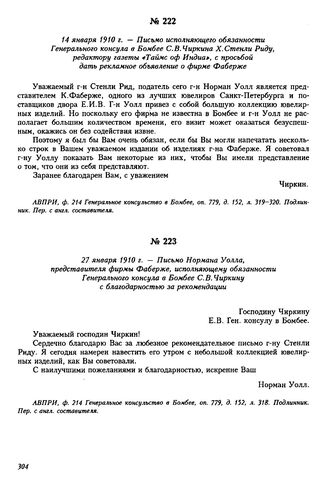 14 января 1910 г. — Письмо исполняющего обязанности Генерального консула в Бомбее С.В. Чиркина X. Стенли Риду, редактору газеты «Таймс оф Индиа», с просьбой дать рекламное объявление о фирме Фаберже