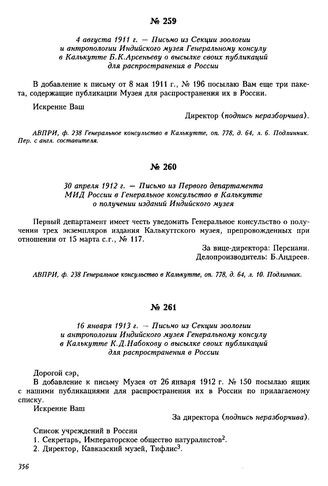 16 января 1913 г. — Письмо из Секции зоологии и антропологии Индийского музея Генеральному консулу в Калькутте К.Д. Набокову о высылке своих публикаций для распространения в России