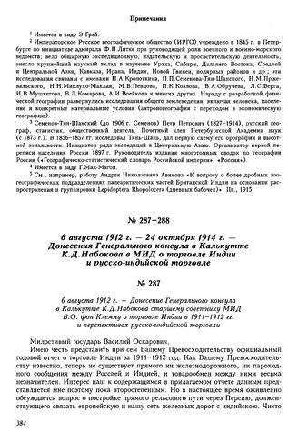 6 августа 1912 г. — Донесение Генерального консула в Калькутте К.Д. Набокова старшему советнику МИД В.О. фон Клемму о торговле Индии в 1911-1912 гг. и перспективах русско-индийской торговли // АВПРИ, ф. 147 Среднеазиатский стол, оп. 485, д. 969, л. 34-35 и об. Подлинник.