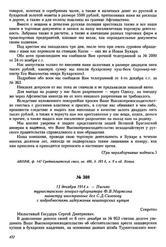 13 декабря 1914 г. — Письмо туркестанского генерал-губернатора Ф.В. Мартсона министру иностранных дел С.Д. Сазонову с подробностями задержания пешаварских купцов