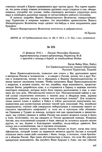 21 февраля 1916 г. — Письмо Махендры Пратапа туркестанскому генерал-губернатору Мартсону Ф.В. с просьбой о помощи в борьбе за освобождение Индии. Кабул // АВПРИ, ф. 147 Среднеазиатский стол, оп. 486, д. 338 б, л. 28 и об. Копия.