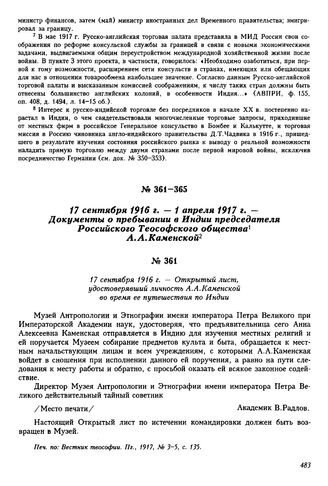 17 сентября 1916 г. — Открытый лист, удостоверявший личность А.А. Каменской во время ее путешествия по Индии // Печ. по: Вестник теософии. Пг., 1917, № 3-5, с. 135.