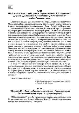 1702 г. марта не ранее 23. — Из грамоты Разрядного приказа Б.П. Шереметеву с одобрением действий войск олонецкого воеводы С.Ф. Барятинского в районе Ладожского озера // РГАДА, Разрядный приказ, Московский стол, стб. 795, ч. II, лл. 60, 62-63. Отпуск.