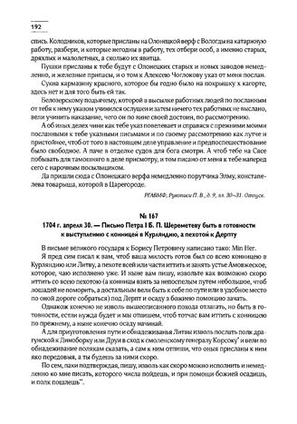 1704 г. апреля 30. — Письмо Петра I Б.П. Шереметеву быть в готовности к выступлению с конницей в Курляндию, а пехотой к Дерпту // П. и Б., т. III, № 645.