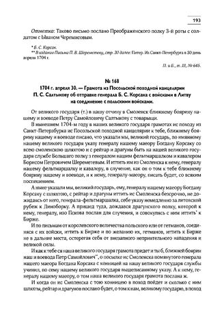 1704 г. апреля 30. — Грамота из Посольской походной канцелярии П.С. Салтыкову об отправке генерала Б.С. Корсака с войсками в Литву на соединение с польскими войсками // РГАДА, Приказные дела новых лет, 1704 г., д. 8, л. 26 и об. Отпуск.