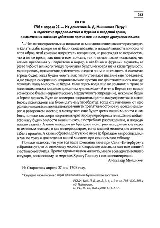 1708 г. апреля 27. — Из донесения А.Д. Меншикова Петру I о недостатке продовольствия и фуража в шведской армии, о намеченных военных действиях против нее и о смотре драгунских полков // РГАДА, Каб. П. В., оп. 5, д. 1, ч. 2 а, лл. 798-800, 804 и об. Подлинник. П. и Б., т. VII, вып. 1, стр. 574-577.