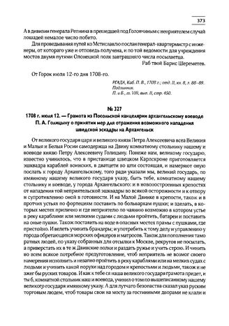 1708 г. июля 12. — Грамота из Посольской канцелярии архангельскому воеводе П.А. Голицыну о принятии мер для отражения возможного нападения шведской эскадры на Архангельск // РГАДА, Письма разных лиц на рус. яз., 1708 г., оп. 1, д. 9, лл. 36 об.-37 об. Отпуск. П. и Б., т. VIII, вып. II, стр. 445-446.