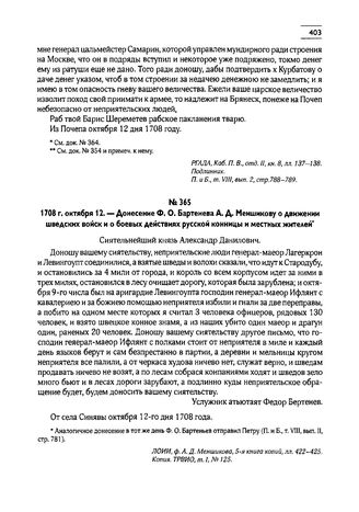 1708 г. октября 12. — Донесение Ф.О. Бартенева А.Д. Меншикову о движении шведских войск и о боевых действиях русской конницы и местных жителей // ЛОИИ, ф. А.Д. Меншикова, 5-я книга копий, лл. 422-425. Копия. ТРВИО, т. I, № 125.