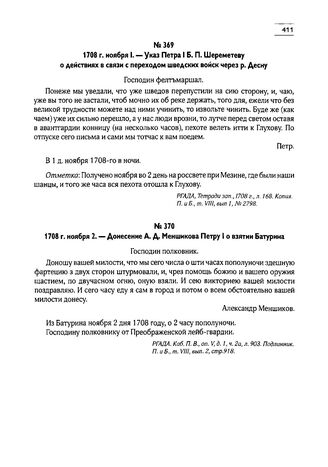 1708 г. ноября 2. — Донесение А.Д. Меншикова Петру I о взятии Батурина // РГАДА, Каб. П. В., оп. V, д. 1, ч. 2а, л. 903. Подлинник. П. и Б., т. VIII, вып. 2, стр. 918.