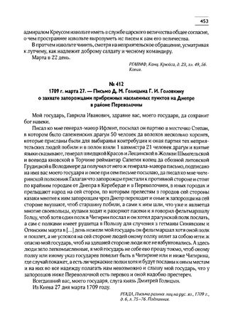 1709 г. марта 27. — Письмо Д.М. Голицына Г.И. Головкину о захвате запорожцами прибрежных населенных пунктов на Днепре в районе Переволочны // РГАДА, Письма разных лиц на рус. яз., 1709 г., д. 6, л. 75-76. Подлинник.