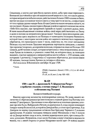 1709 г. мая 29. — Донесение Б.П. Шереметева Петру I о прибытии с полками, о составе отряда Г.С. Волконского и обстановке под Полтавой // РГАДА, Каб. П. В., отд. II, кн. 10, лл. 285 и об. Подлинник. П. и Б., т. IX, вып. 2, стр. 916-917.