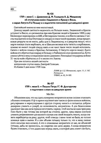 1709 г. июня 5. — Донесение Д.М. Голицына А.Д. Меншикову об отступлении войск Лещинского и Красау к Висле, о марше Августа II в Польшу и о недостатке пополнений для шведской армии // ЛОИИ, ф. А.Д. Меншикова, карт. 11, д. 142. Подлинник. ТРВИО, т. Ill, № 183.