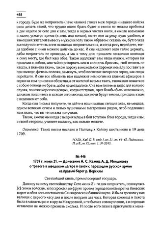 1709 г. июня 21. — Донесение А.С. Келена А.Д. Меншикову о тревоге в шведском лагере в связи с переходом русской армии на правый берег р. Ворсклы // ЛОИИ, ф. А.Д. Меншикова, карт. 11, д. 200, л. 1. Расшифрованный текст. П. и Б., т. IX, вып. 2, стр. 967.