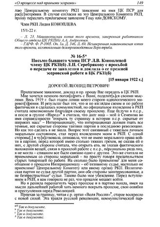 Письмо бывшего члена ПСР Л.В. Коноплевой члену ЦК РКП(б) Л.П. Серебрякову с просьбой о передаче ее заявления и доклада о ее прежней эсеровской работе в ЦК РКП(б). [15 января 1922 г.] // АПРФ. Ф. 3. Оп. 59. Д. 16. Л. 24-27. Машинописная копия; ГАРФ. Ф. Р-1005. Оп. 1. Д. 346. Л. 70-78. Машинописная копия; Костин Н.Д. Суд над террором. М., 1990. С. 11-12.