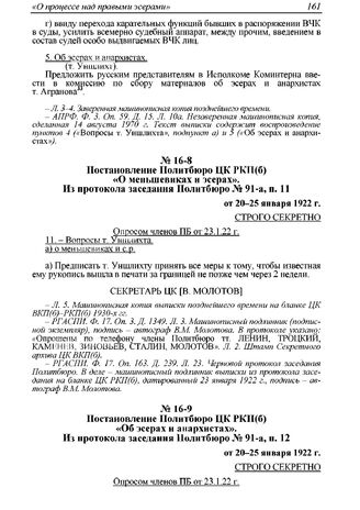 Постановление Политбюро ЦК РКП(б) «О меньшевиках и эсерах». Из протокола заседания Политбюро № 91-а, п. 11 от 20-25 января 1922 г. // АПРФ. Ф. 3. Оп. 59. Д. 16. Л. 5. Машинописная копия; РГАСПИ. Ф. 17. Оп. 3. Д. 1349. Л. 3. Машинописный подлинник; РГАСПИ. Ф. 17. Оп. 163. Д. 239. Л. 23. Черновой протокол заседания.