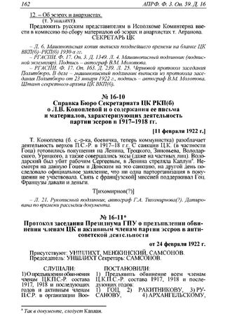 Протокол заседания Президиума ГПУ о предъявлении обвинения членам ЦК и активным членам партии эсеров в антисоветской деятельности от 24 февраля 1922 г. // АПРФ. Ф. 3. Оп. 59. Д. 16. Л. 38-38 об. Заверенная машинописная копия; Л. 56-58. Машинописная копия.