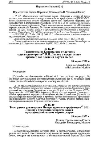 Телеграмма руководства Интернационала профсоюзов В.И. Ленину с требованием прекращения преследований членов партии эсеров. 18 марта 1922 г.