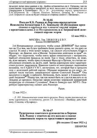 Телеграмма Советского руководства в Берлин К.Б. Радеку с ответом на его письмо о списке защитников эсеров на предстоящем процессе. [Не позднее 12 мая 1922 г.]