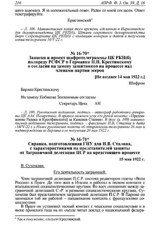 Справка, подготовленная ГПУ для И.В. Сталина с характеристиками на представителей защиты от Заграничной делегации ПСР на предстоящем процессе. 15 мая 1922 г. // АПРФ. Ф. 3. Оп. 59. Д. 16. Л. 111-112. Машинописная копия; РГАСПИ. Ф. 17. Оп. 84. Д. 453. Л. 41-42.