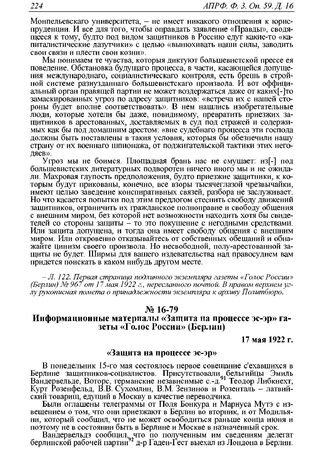 Информационные материалы «Защита на процессе эс-эр» газеты «Голос России» (Берлин). 17 мая 1922 г.