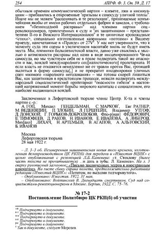 Постановление Политбюро ЦК РКП(б) об участии представителей Коминтерна в комиссии Политбюро по наблюдению за подготовкой и ходом процесса. Из протокола заседания Политбюро № 9, п. 9 от 1 июня 1922 г. // АПРФ. Ф. 3. Оп. 59. Д. 17. Л. 1. Машинописная копия; РГАСПИ. Ф. 17. Оп. 163. Д. 278. Л. 11. Черновой протокол заседания; РГАСПИ. Ф. 17. Оп. 3. Д. 1388. Л. 9. Машинописный подлинник.