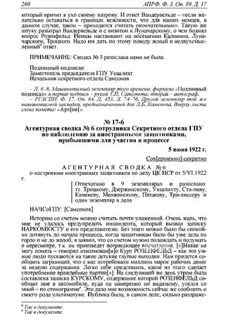 Агентурная сводка № 6 сотрудника Секретного отдела ГПУ по наблюдению за иностранными защитниками, прибывшими для участия в процессе. 5 июня 1922 г.