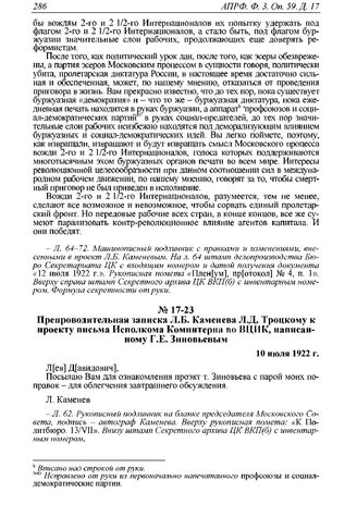Препроводительная записка Л.Б. Каменева Л.Д. Троцкому к проекту письма Исполкома Коминтерна во ВЦИК, написанному Г.Е. Зиновьевым. 10 июля 1922 г. // АПРФ. Ф. 3. Оп. 59. Д. 17. Л. 62. Рукописный подлинник.