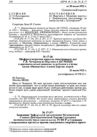Заявление Эрфуртской организации Независимой Социал-Демократической Партии Германии полномочному представительству РСФСР в Германии с выражением протеста против ожидаемого смертного приговора группе членов ПСР на процессе. 21 июля 1922 г.