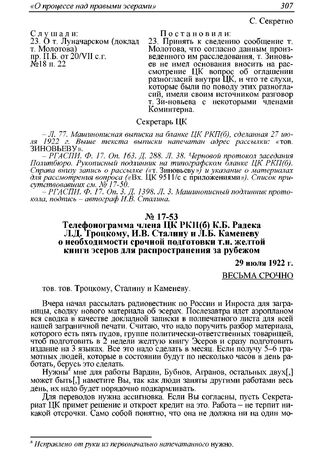 Телефонограмма члена ЦК РКП(б) К.Б. Радека Л.Д. Троцкому, И.В. Сталину и Л.Б. Каменеву о необходимости срочной подготовки т.н. желтой книги эсеров для распространения за рубежом. 29 июля 1922 г. // АПРФ. Ф. 3. Оп. 59. Д. 17. Л. 101. Машинописная незаверенная копия.