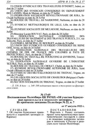 Постановление Политбюро ЦК РКП(б) «Об участии буржуазных правительств в эсеровских заговорах». Из протокола заседания Политбюро № 22, п. 7 от 17 августа 1922 г. // АПРФ. Ф. 3. Оп. 59. Д. 17. Л. 189. Машинописная выписка; Л. 189. Машинописная выписка; РГАСПИ. Ф. 17. Оп. 3. Д. 1401. Л. 2. Машинописный подлинник протокола заседания.