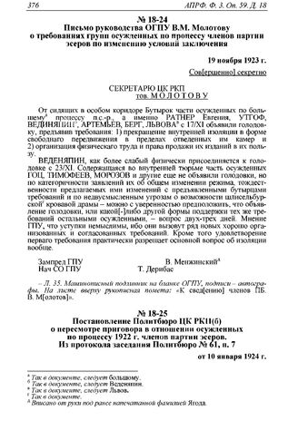 Постановление Политбюро ЦК РКП(б) о пересмотре приговора в отношении осужденных по процессу 1922 г. членов партии эсеров. Из протокола заседания Политбюро № 61, п. 7 от 10 января 1924 г.