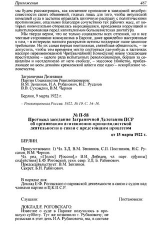 Протокол заседания Заграничной Делегации ПСР об организации агитационно-пропагандистской деятельности в связи с предстоящим процессом от 15 марта 1922 г. // ГАРФ. Ф. 5847. Оп. 2. Д. 131. Л. 75-77. Машинописная копия.