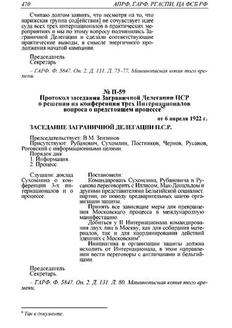 Протокол заседания Заграничной Делегации ПСР о решении на конференции трех Интернационалов вопроса о предстоящем процессе от 6 апреля 1922 г. // ГАРФ. Ф. 5847. Оп. 2. Д. 131. Л. 80. Машинописная копия.