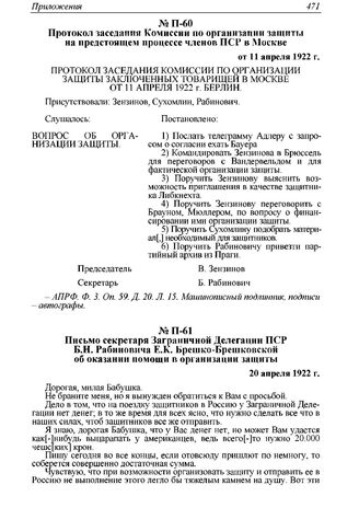 Письмо секретаря Заграничной Делегации ПСР Б.Н. Рабиновича Е.К. Брешко-Брешковской об оказании помощи в организации защиты. 20 апреля 1922 г.