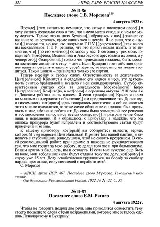 Последнее слово С.В. Морозова. 4 августа 1922 г. // МИСИ. Архив ПСР. 867. Последнее слово Морозова. Рукописный подлинник; Революционная Россия. 1922. № 21-22. С. 30.