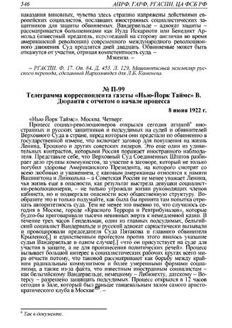 Телеграмма корреспондента газеты «Нью-Йорк Таймс» В. Дюранти с отчетом о начале процесса. 8 июня 1922 г. // РГАСПИ. Ф. 17. Оп. 84. Д. 453. Л. 127. Машинописный экземпляр русского перевода.