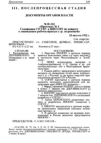 Протокол № 1 Совещания СО ГПУ и ИНО ГПУ по вопросу о ликвидации работы правых с.-р. заграницей от 23 августа 1922 г. // РГАСПИ. Ф. 76. Оп. 3. Д. 49. Л. 99. Машинописная заверенная копия; Партия социалистов-революционеров. Документы и материалы. Т. 3. Ч. 2. С. 960.