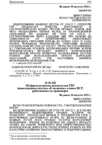 Шифротелеграмма руководства ГПУ транспортным отделам об «изъятии» членов ПСР, работающих на транспорте. Не ранее 10 августа 1922 г. // РГАСПИ. Ф. 76. Оп. 3. Д. 49. Л. 96. Машинописная копия.