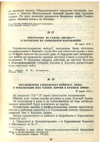 Постановление Харьковского комитета РКП(б) о мобилизации всех членов партии в Красную армию. 27 марта 1918 г. // Газ. «Донецкий пролетарий», № 113, Харьков, 6 апреля 1918 г.