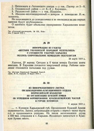 Информация из газеты «Вестник Украинской Народной Республики» о готовности рабочих Харькова оказать сопротивление немецким оккупантам. 29 марта 1918 г. // Газ. «Вестник Украинской Народной Республики», № 51, Харьков, 30 марта 1918 г.