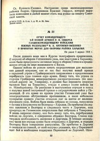 Отчет командующего 2-й особой армией Р. Ф. Сиверса Главнокомандующему войсками Южных республик В. А. Антонову-Овсеенко о принятых мерах для обороны района Харькова. Не ранее 9 апреля 1918 г.