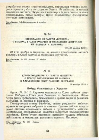 Корреспонденция из газеты «Беднота» о победе большевиков на выборах в Харьковский Совет рабочих депутатов. 26 ноября 1918 г. // Газ. «Беднота», № 199, Москва, 27 ноября 1918 г.