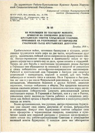 Из резолюции по текущему моменту, принятой на совещании депутатов крестьянских Советов Харьковской губернии, прибывших на разогнанный петлюровцами губернский съезд крестьянских депутатов. Декабрь 1918 г.