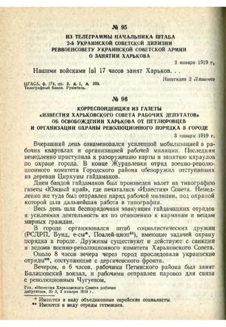 Корреспонденция из газеты «Известия Харьковского Совета рабочих депутатов» об освобождении Харькова от петлюровцев и организации охраны революционного порядка в городе. 3 января 1919 г. // Газ. «Известия Харьковского Совета рабочих депутатов», № 5, 3 января 1919 г.