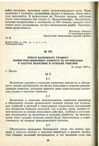 Приказ Валковского уездного военно-революционного комитета об организации и задачах волостных и сельских ревкомов. 15 января 1919 г. Г. Валки