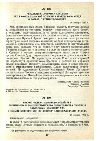 Письмо отдела народного хозяйства Временного рабоче-крестьянского правительства Украины заводскому комитету ХПЗ о созыве конференции по вопросу национализации завода. 28 января 1919 г.
