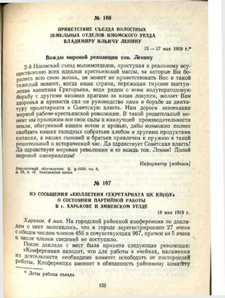 Из сообщения «Бюллетеня Секретариата ЦК КП(б)У» о состоянии партийной работы в г. Харькове и Змиевском уезде. 18 мая 1919 г.