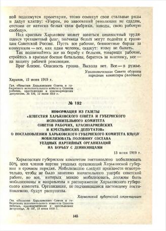 Информация из газеты «Известия Харьковского Совета и губернского Исполнительного комитета Советов рабочих, красноармейских и крестьянских депутатов» о постановлении Харьковского губернского комитета КП(б)У мобилизовать половину состава уездных партийных организаций на борьбу с деникинцами. 13 июня 1919 г. // Газ. «Известия Харьковского Совета и губернского Исполнительного комитета Советов рабочих, Красноармейских и крестьянских депутатов», № 137, 13 июня 1919 г.