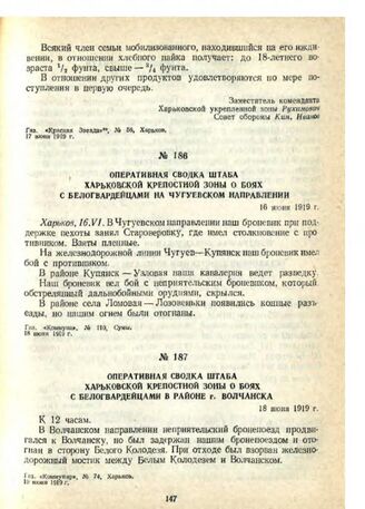 Оперативная сводка штаба Харьковской крепостной зоны о боях с белогвардейцами в районе г. Волчанска. 18 июня 1919 г.